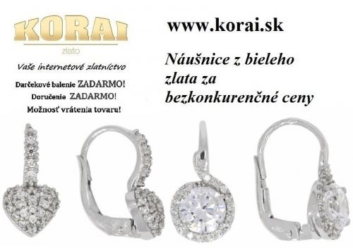 Potešte svojich blízkych a obdarujte ich náušnicami z bieleho zlata. Navštívte náš internetový obchod so šperkami KORAI, kde nájdete skutočne široký výber náušníc zo 14 karátového bieleho zlata za bezkonkurenčné ceny. Ponúkame jednoduché menšie, bezkameňové náušnice, výrazné visiace, náušnice zdobené zirkónmi rôznych tvarov a vzorov, kruhy náušnice rôznych veľkostí, ale aj množstvo visiacich náušníc, spomedzi ktorých si určite vyberiete aj Vy. Navštívte e-shop KORAI a zaručene si vyberiete. Internetové zlatníctvo KORAI. E - shop KORAI. E - shop KORAI Vaše internetové zlatníctvo ponúka zlato.