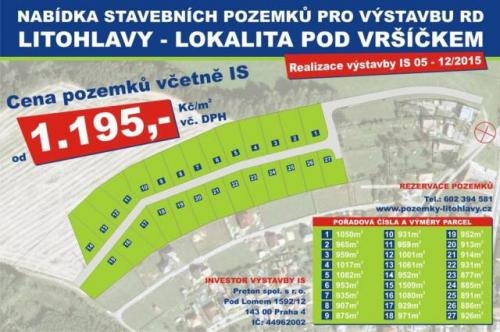 Nabízím k okamžité koupi stavební parcelu dle vlastního výběru (900 - 1100 m2) určenou pro výstavbu rod. domu v obci Litohlavy (16km od centra Plzně, 4km od centra Rokycan a 1,5km od dálničního nájezdu) s mimořádnou slevou 500,-Kč/m2, tj. již za 795,-Kč/m2 vč. přípojek inž. sítí, nové komunikace a DPH. Inženýrské sítě budou kompletně dokončeny v letošním roce. Zahájení výstavby inž. sítí už za měsíc. Cena zasíťované parcely po dokončení bude 1295,-Kč/m2 vč. DPH. Tato nabídka má omezenou platnost, proto neváhejte! Spěchá - v případě zájmu volejte: 602 394 581. Web: http://www.pozemky-litohlavy.cz