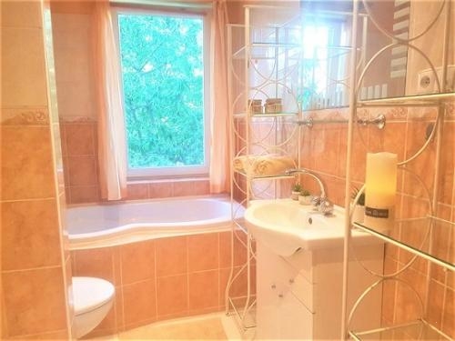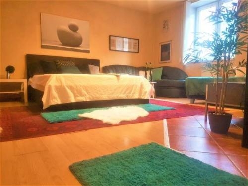 Spodní menší byt 1+kk o podlahové ploše 45m2 byl k domu přistavěn v roce 2018. Je s oknem do zahrady a okýnkem do tiché slepé ulice. Vyhříván je taktéž krbovými kamny, součástí je koupelna s WC.