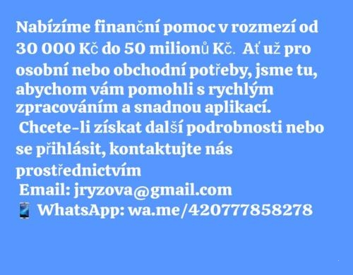 Dobrý den, chybí vám hotovost, potřebujete půjčku na zaplacení účtů nebo zahájení podnikání, koupi auta, zaplacení účtů, máme pro vás nejlepší nabídku, naše úvěrové služby jsou 100% garantovány, nabízíme všechny typy půjček od 35 000 Kč do 90 000 000 Kč s velmi flexibilní sazbou 3 %, pro více informací nás kontaktujte na: email: